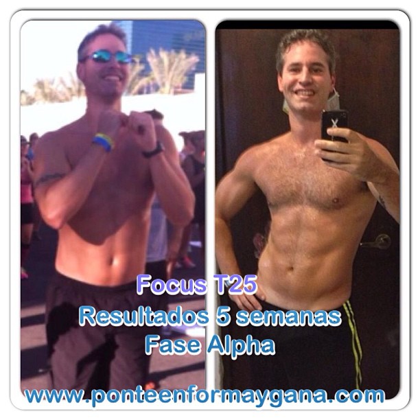 Esta foto, cortesía de una compañera Coach Tara Davis, presenta mi antes de comenzar Focus T25, y 5 semanas después. Como verás en la de antes, yo estaba en forma, sin embargo, no tenía la definición que tengo en la otra. En aquella yo estaba en 170-171 libras. En la otra como 2-3 libras menos, y hoy estoy 5-6 menos que el día 1. He bajado pulgada y media de cintura. Pantalones que en la foto de antes me estaban quedando apretados, ahora necesito reforzarlos más con la correa. Y en cuanto a condición física: para mi certificación de Insanity pude hacer casi todo el workout sin breaks.