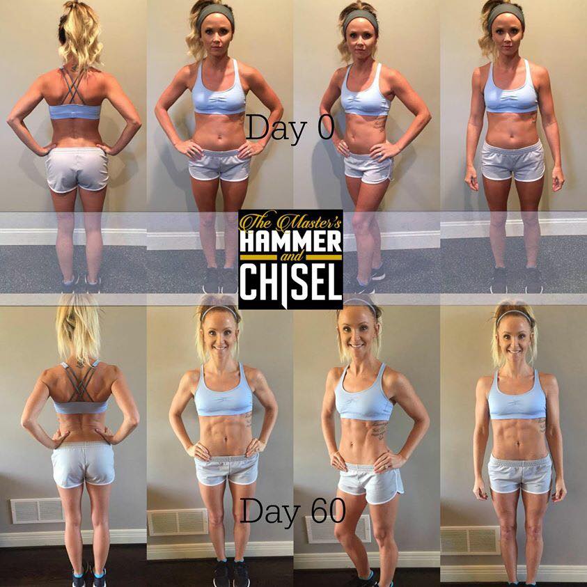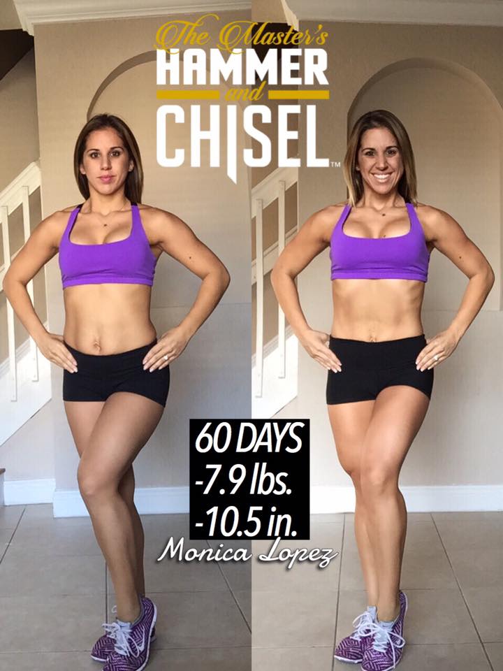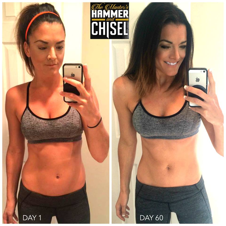 Y mensaje para las chicas: las pesas NO son tus enemigas. No te vas a poner como bodybuilder. Esta muchacha hizo el Hammer and Chisel conmigo, programa basado en PESAS, y perdió solo 2.7lbs. En la foto del Día 1, ella nos contó que hacía ejercicios SIN pesas/resistencia. Miren la diferencia: