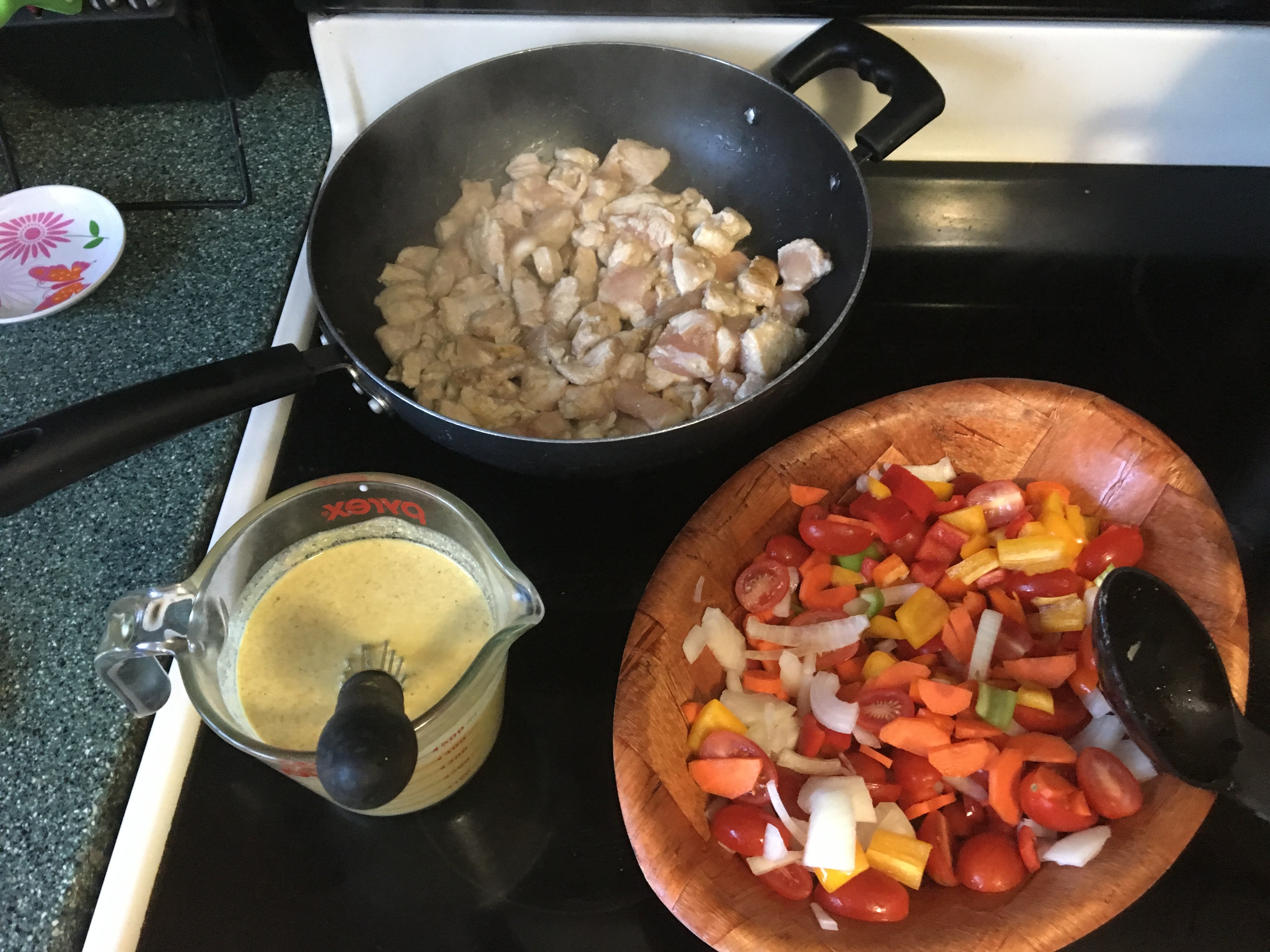 Me dio un poco de frustración pues ya lo que tenía en mente no podía hacerlo, pero uno trabaja con lo que tiene. Por lo tanto abrí la alacena, encontré una leche de coco, curry y otras cosas más y decidí inventar. La mayor preocupación eran las nenas: ¡ojalá les guste!