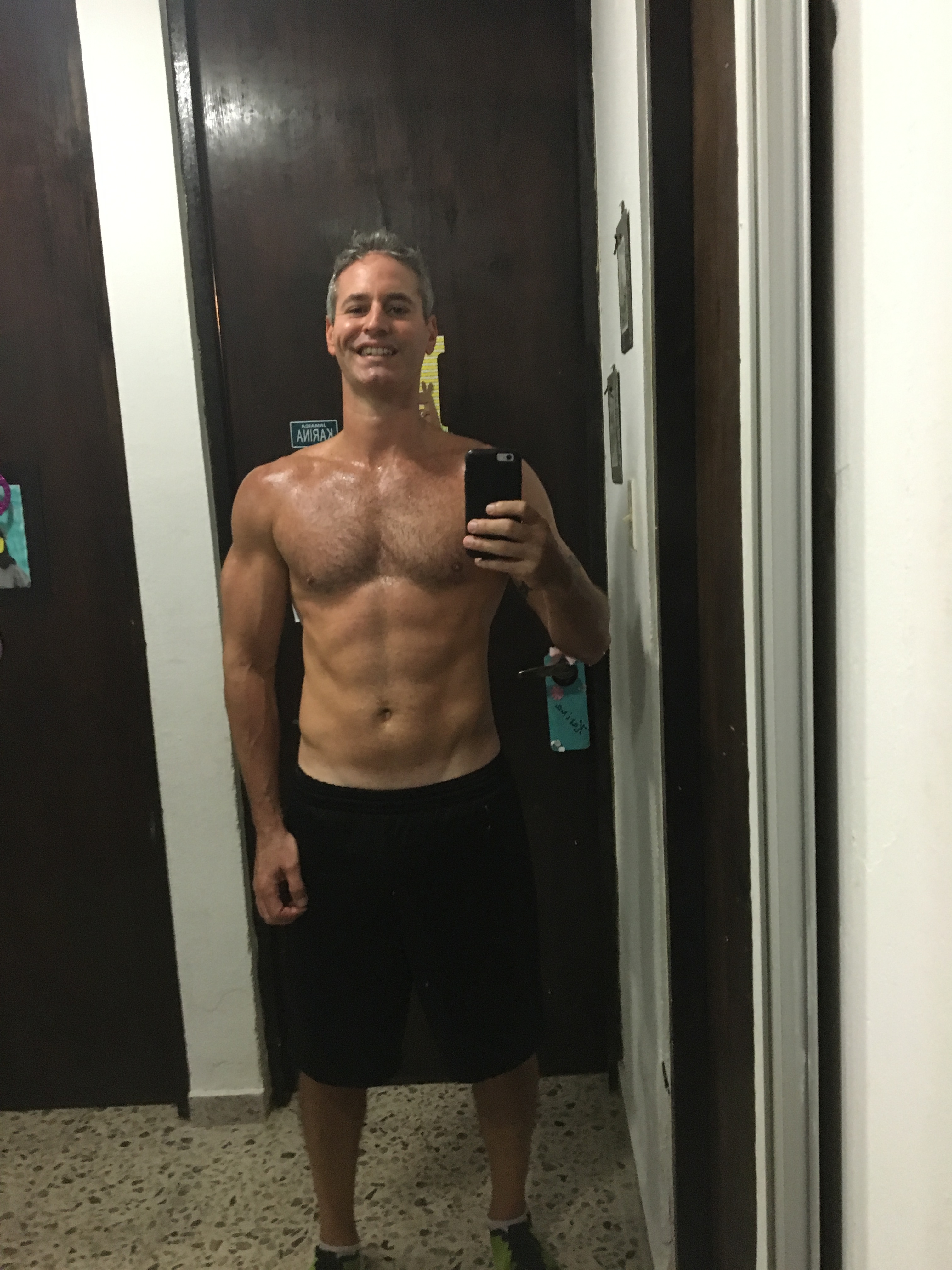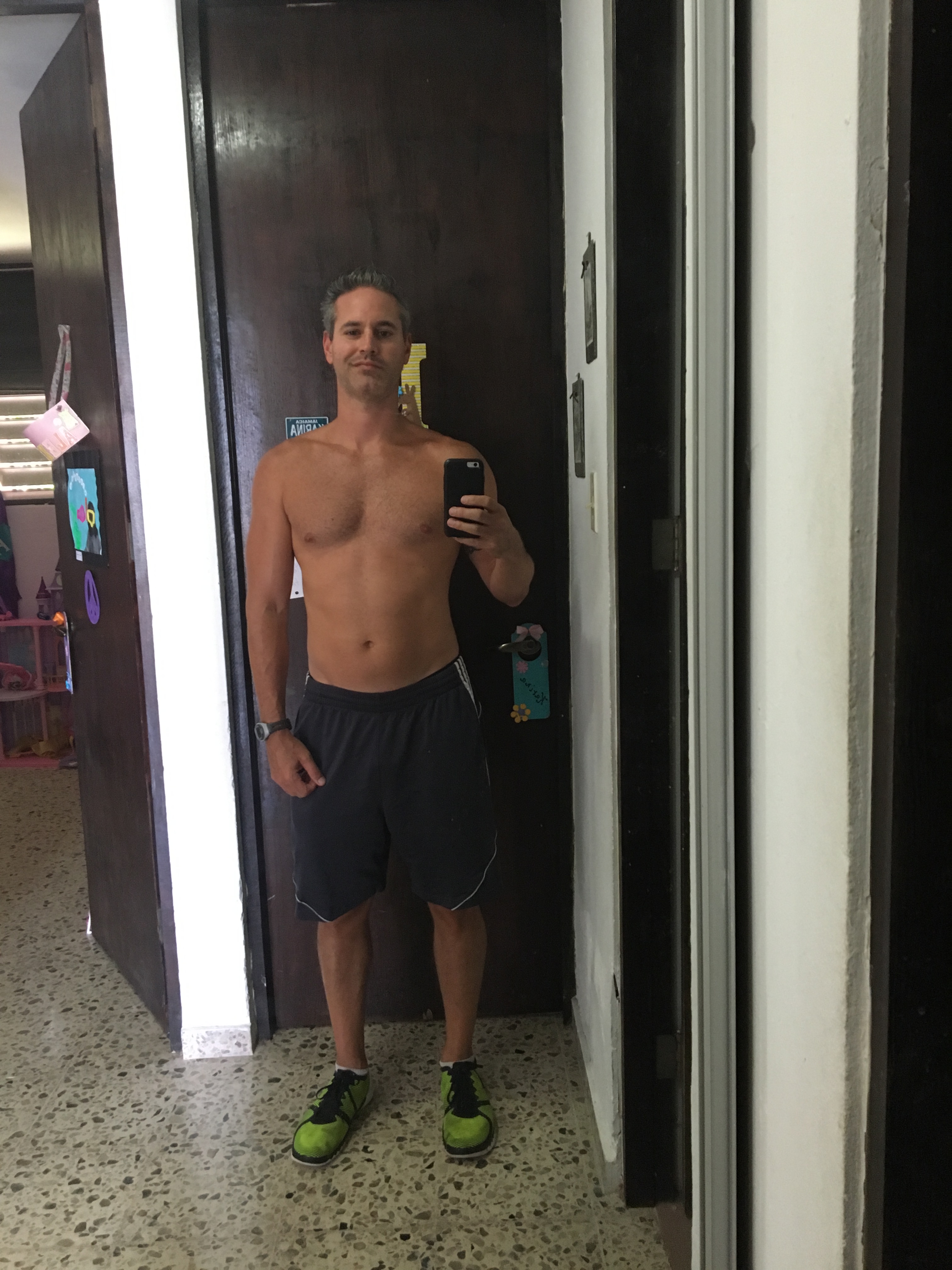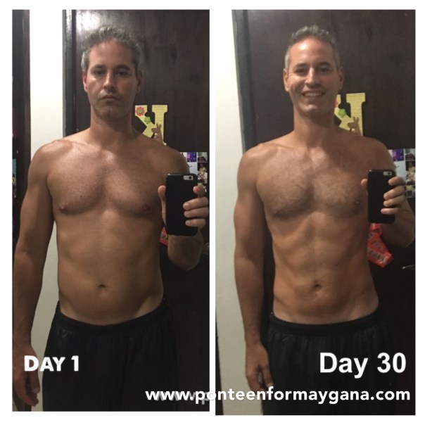 Es evidente en la foto que aumenté masa muscular a la vez que perdí peso. El programa tiene 2 itinerarios, uno enfocado en más ejercicios de resistencia y otro más enfocado en ejercicios cardivasculares. Yo seguí el primer itinerario. Eso es para que vean que lo importante no necesariamente son las libras, sino las pulgadas y la transformación corporal.