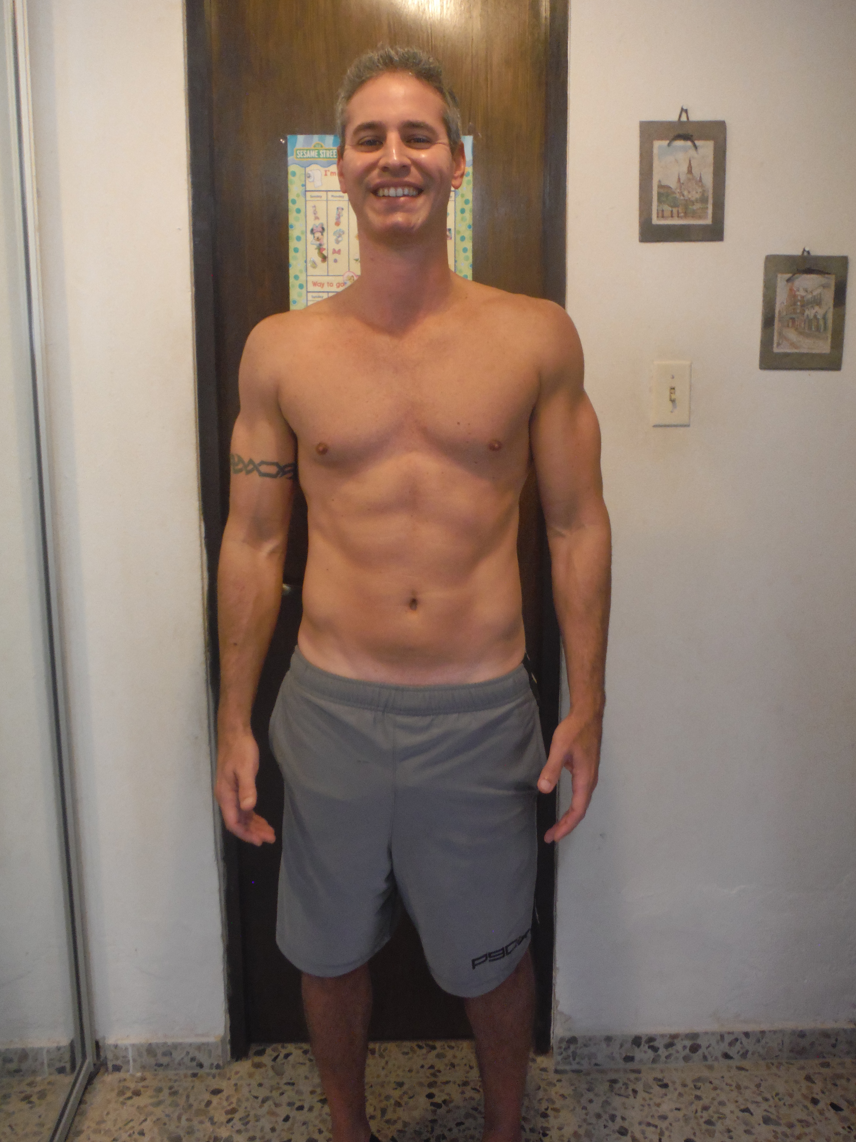 Bajé un total de 2.6lbs, 4.5 pulgadas y 4.1% de grasa corporal. Lo más importante aquí es las pulgadas y elprociento de grasa corporal que perdí. No le hago mucho caso al peso. Para mí es más importante cómo me siento, que los pantalones no me aprieten, y que no me canse rápido. Ah, y los abs marcados son un bono.