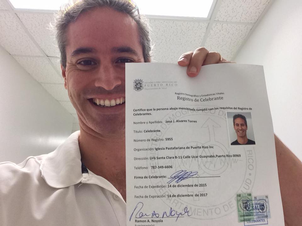 Pues el año pasado, una pareja de amigos míos se comprometen y me preguntan si los puedo casar. Cuando me doy cuenta que es en serio, pues hago las averiguaciones de cómo puedo hacerlo legal. Una cosa es que sea ministro por un website de internet, otra que sea válido en Puerto Rico. Y recordé un artículo de un periódico local de que la Iglesia Pastafariana se había incorporado en la isla. Pues, por ahí me fui. Me ordené, me registré, y ya era oficial que iba a casar a mis panas en abril de 2016. Lo que no me esperaba es que, 2 días después de hacer el anuncio por Facebook, un amigo de San Ignacio me llama para ver si lo podía llamar en 2 semanas. La jueza que los iba a casar desapareció, y al ver lo que publiqué me preguntó si era en serio y si estaba disponible.