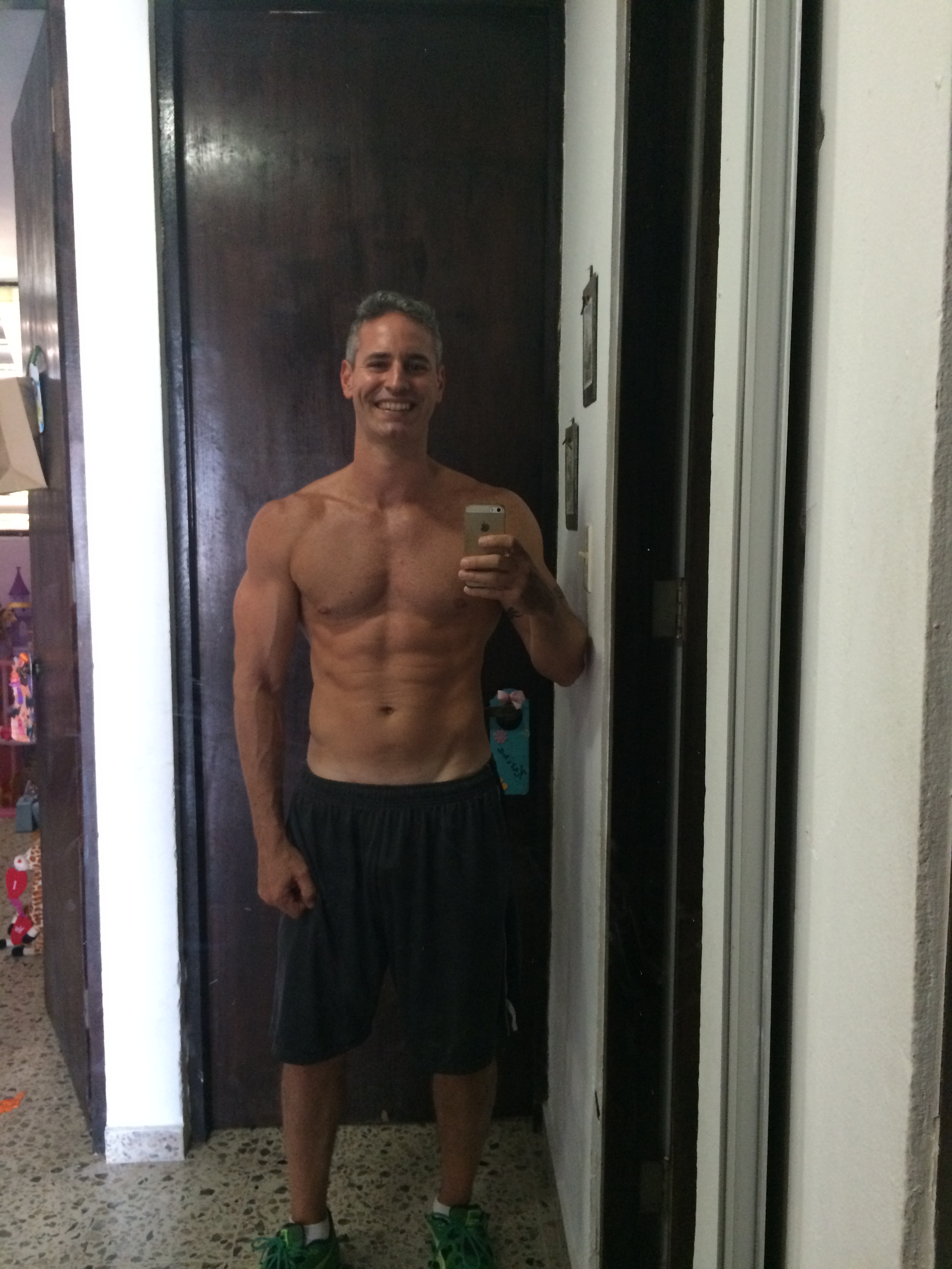Peso 161.8: 12 libras menos y he perdido 6.5″, la mayoría de la barriga. Sí, y por fin se ven los abs. No, no estoy flexing para que se vean. Aquí las fotos side by side: