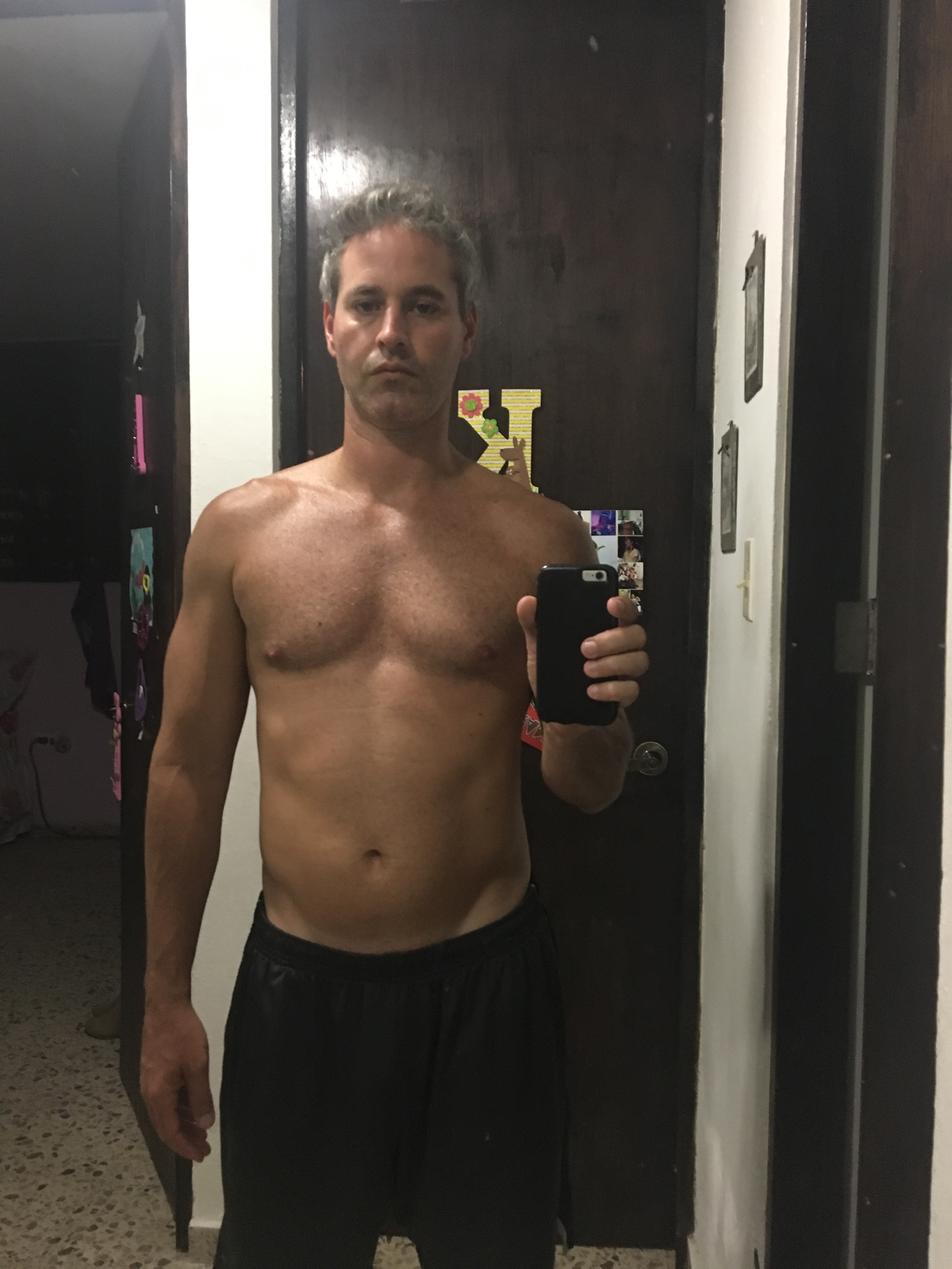 Estoy dormido. Esta foto se tomó a las 4:00am. El peso es 173.8 lbs. Y entiendo que necesito perder peso pues esa barriga no está definida y sé que no he estado comiendo bien. Calculo todo y determino que para perder peso debo seguir el plan B, el cual es de 1500-1800 calorías. Definitivamente menos de lo que yo estaba comiendo anteriormente. Vamos a ver como me va.